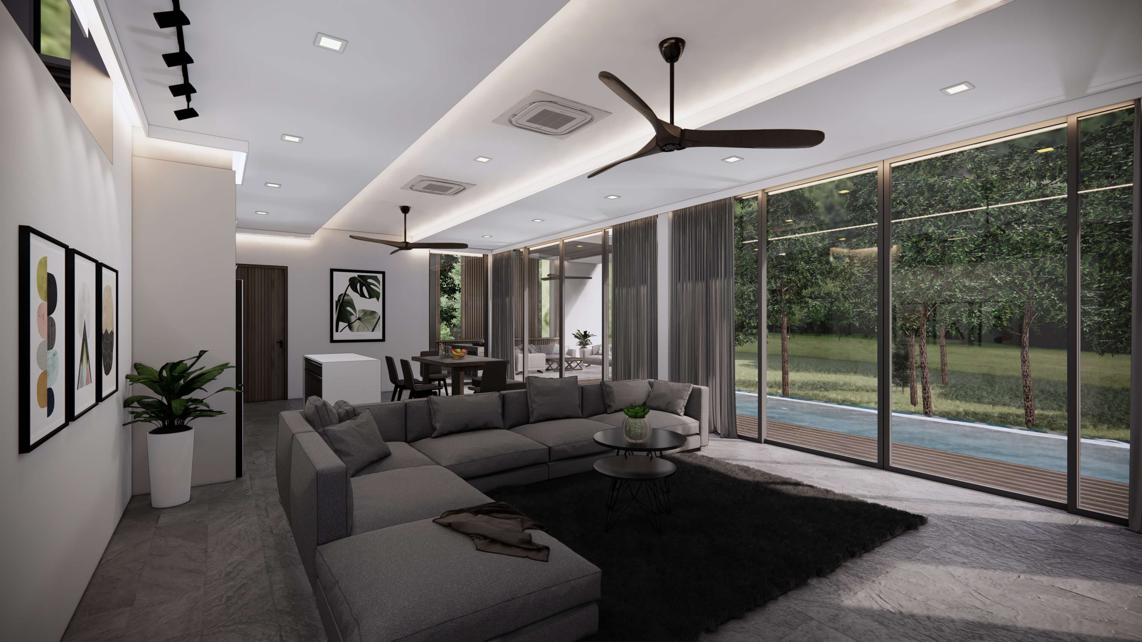 as you enter, greeted by stairs leading to the main living area. Large glass windows throughout the villas invite abundant natural light and breezes, creating bright and vibrant living spaces. The spacious, completely open floor plan offers artistic architectural design and fosters engaging conversations during entertaining. You'll feel deeply connected to nature with the soothing sounds of the waterfall and surroundings.
